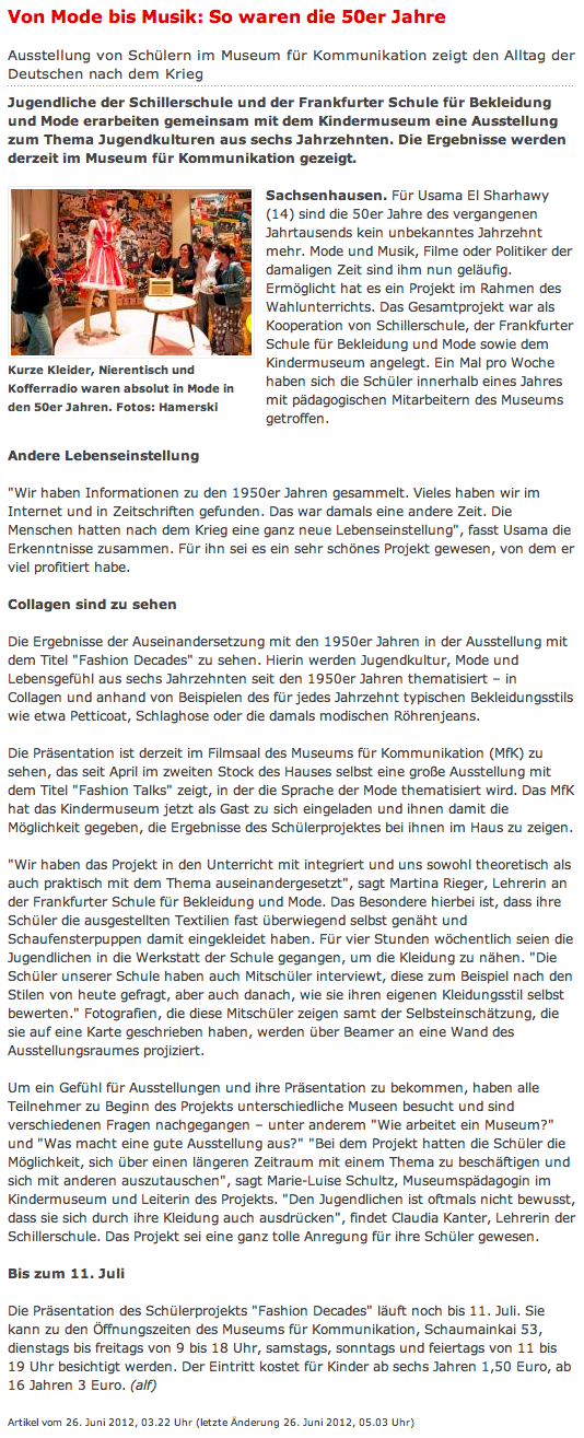 "Von Mode bis Musik: So waren die 50er Jahre", FNP, 06/12